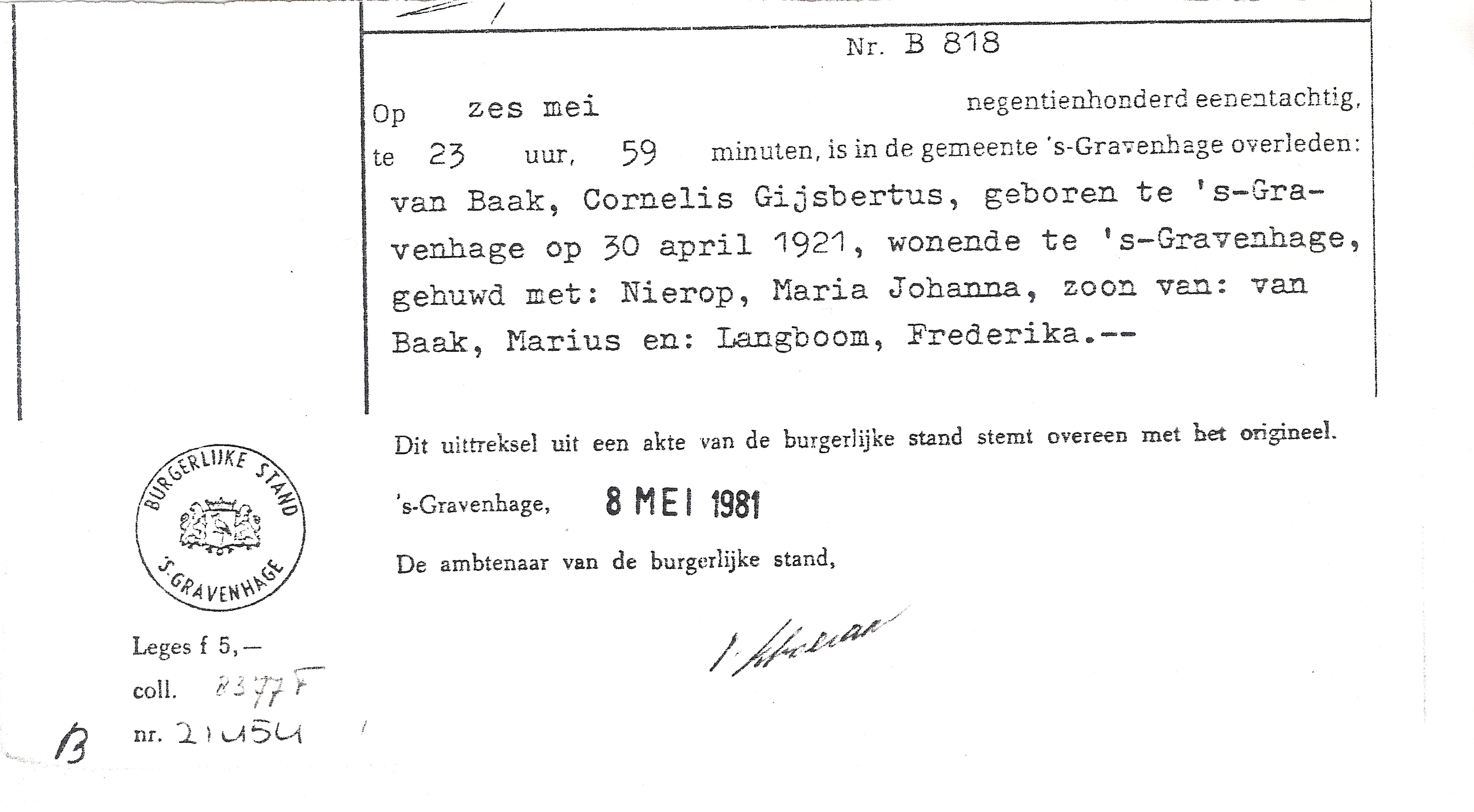 2. “uittreksel BS geboorte Cornelis Gijsbertus van Baak,” 30-4-1921, ’s-Gravenhage, 2750, origineel dokument stadhuis, familie archief van Baak.