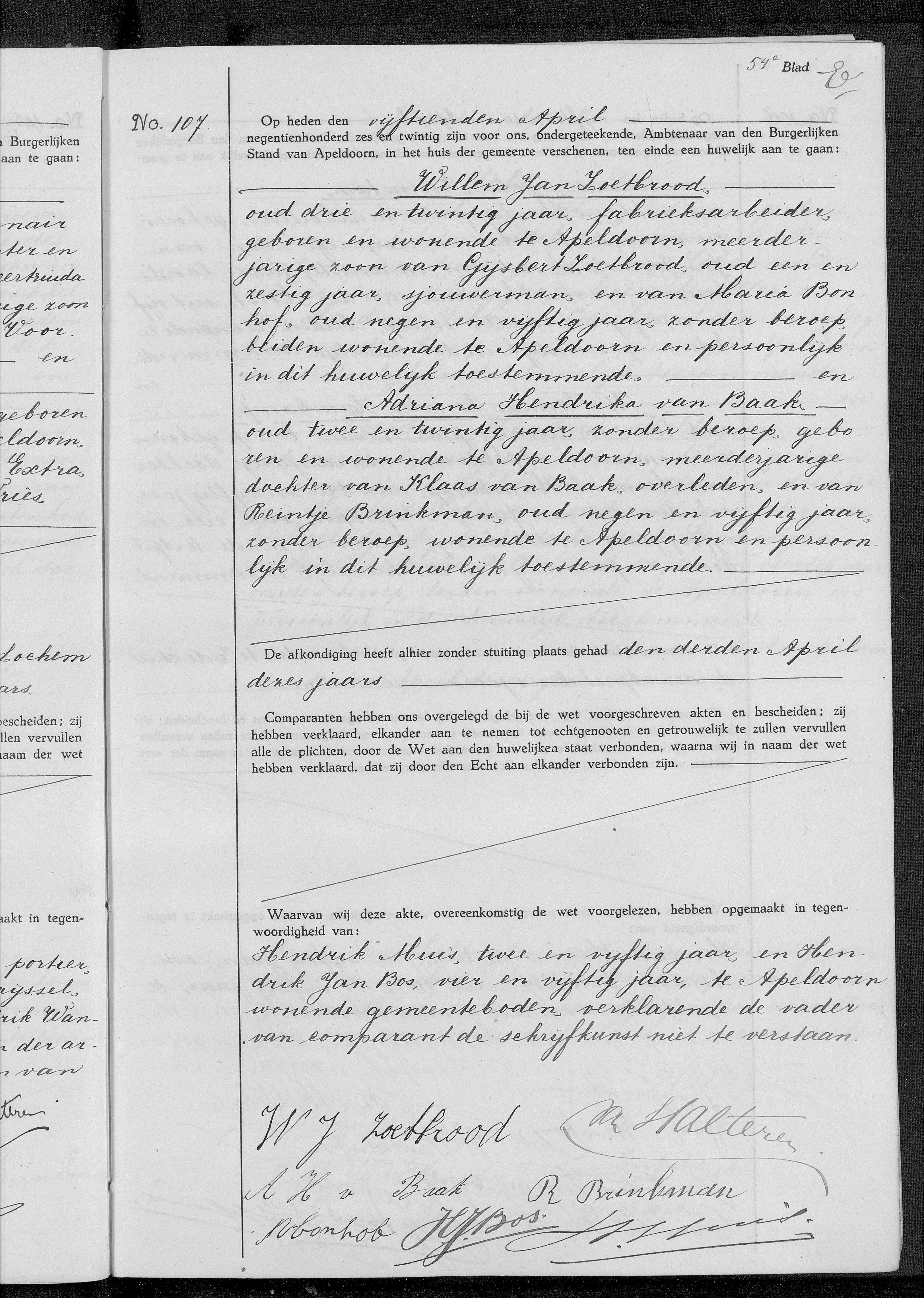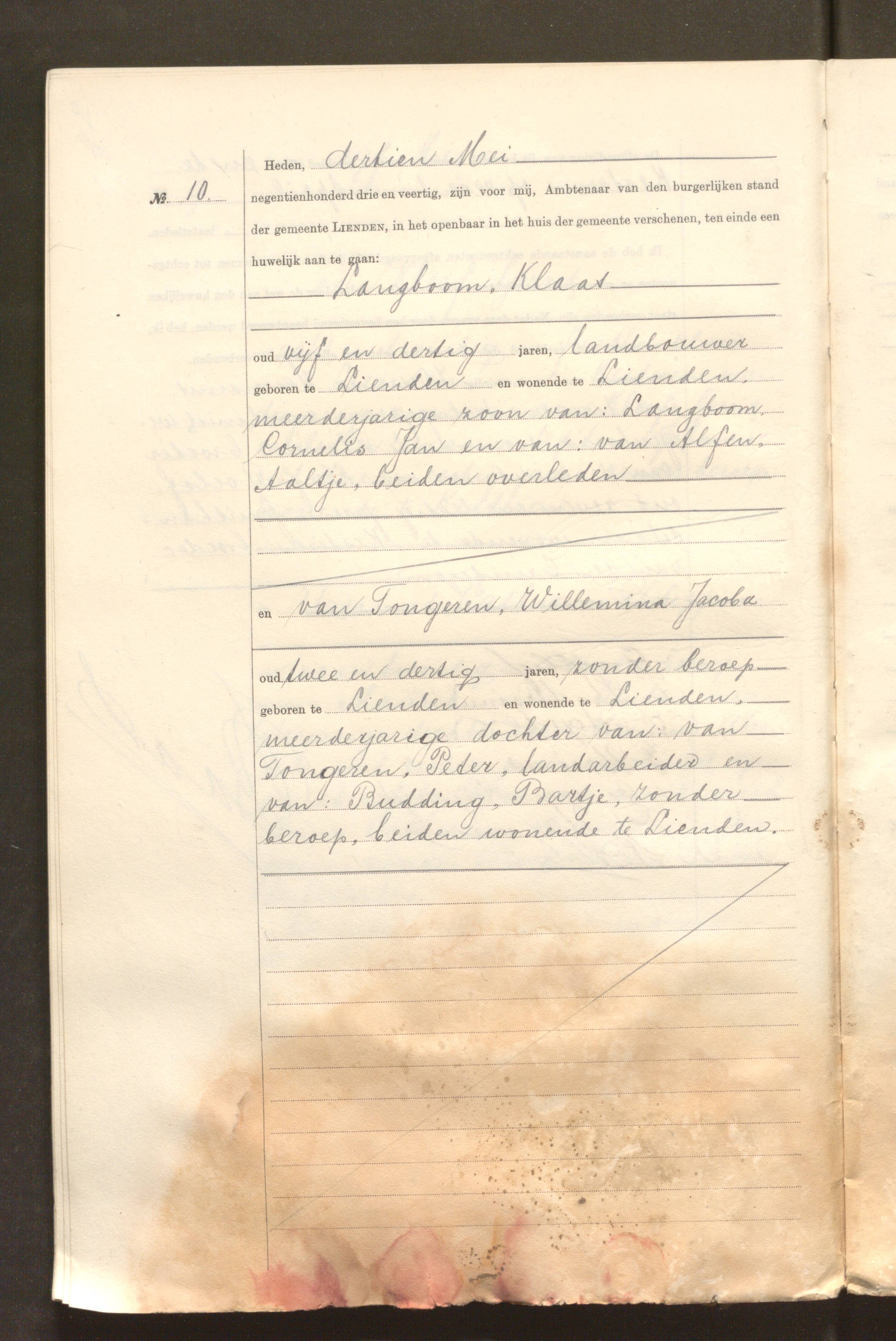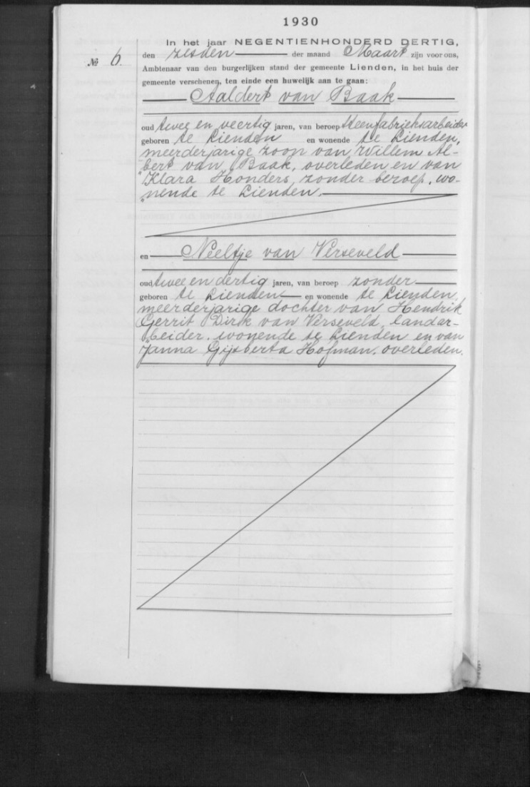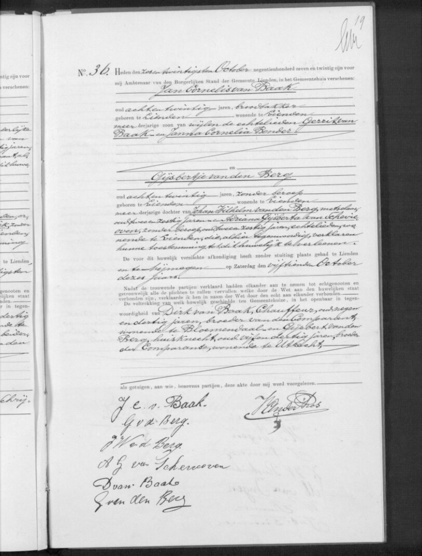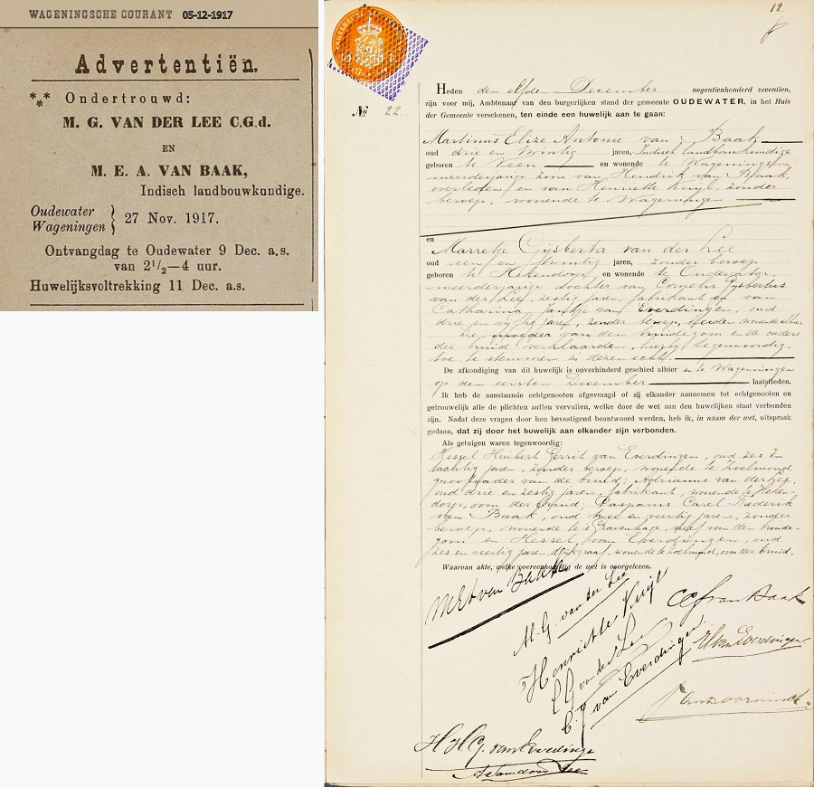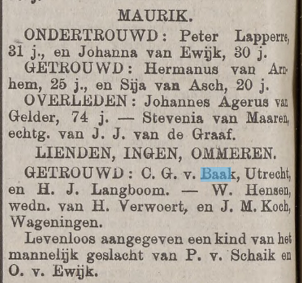20. “uittreksel BS huwelijk van Baak-Langboom,” 3-5-1916, Lienden, 9096, 8, scan, Gelders Archief Arnhem.