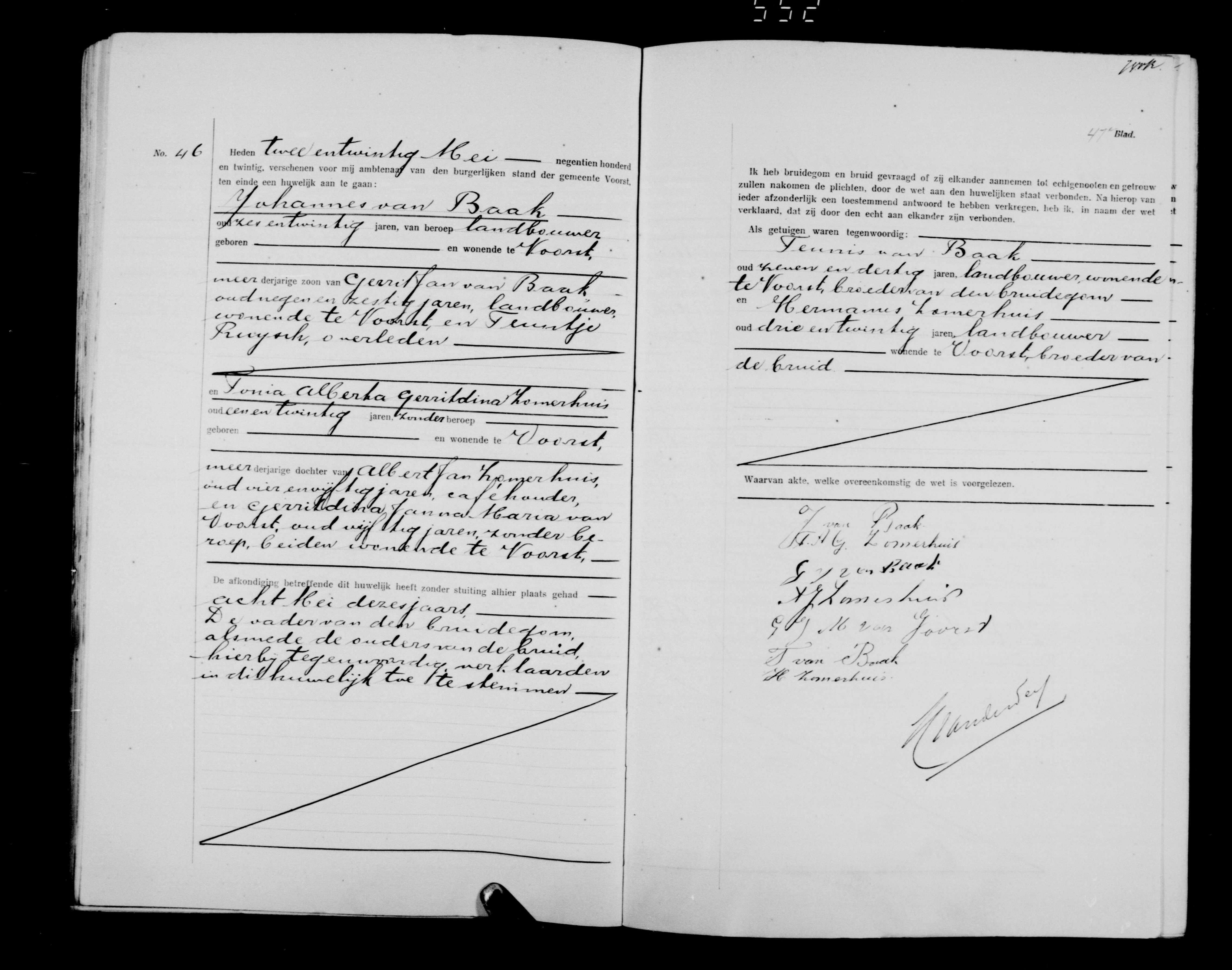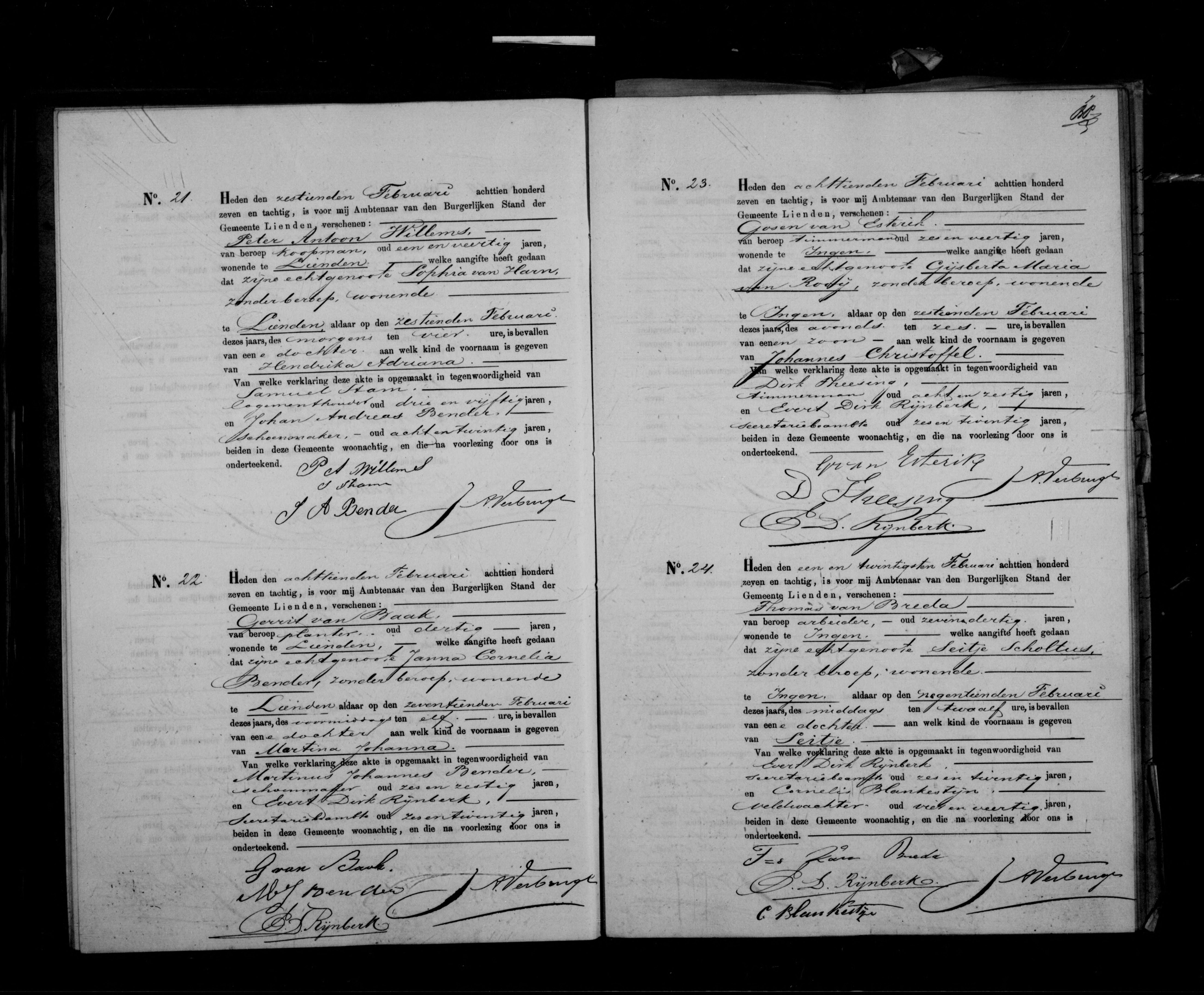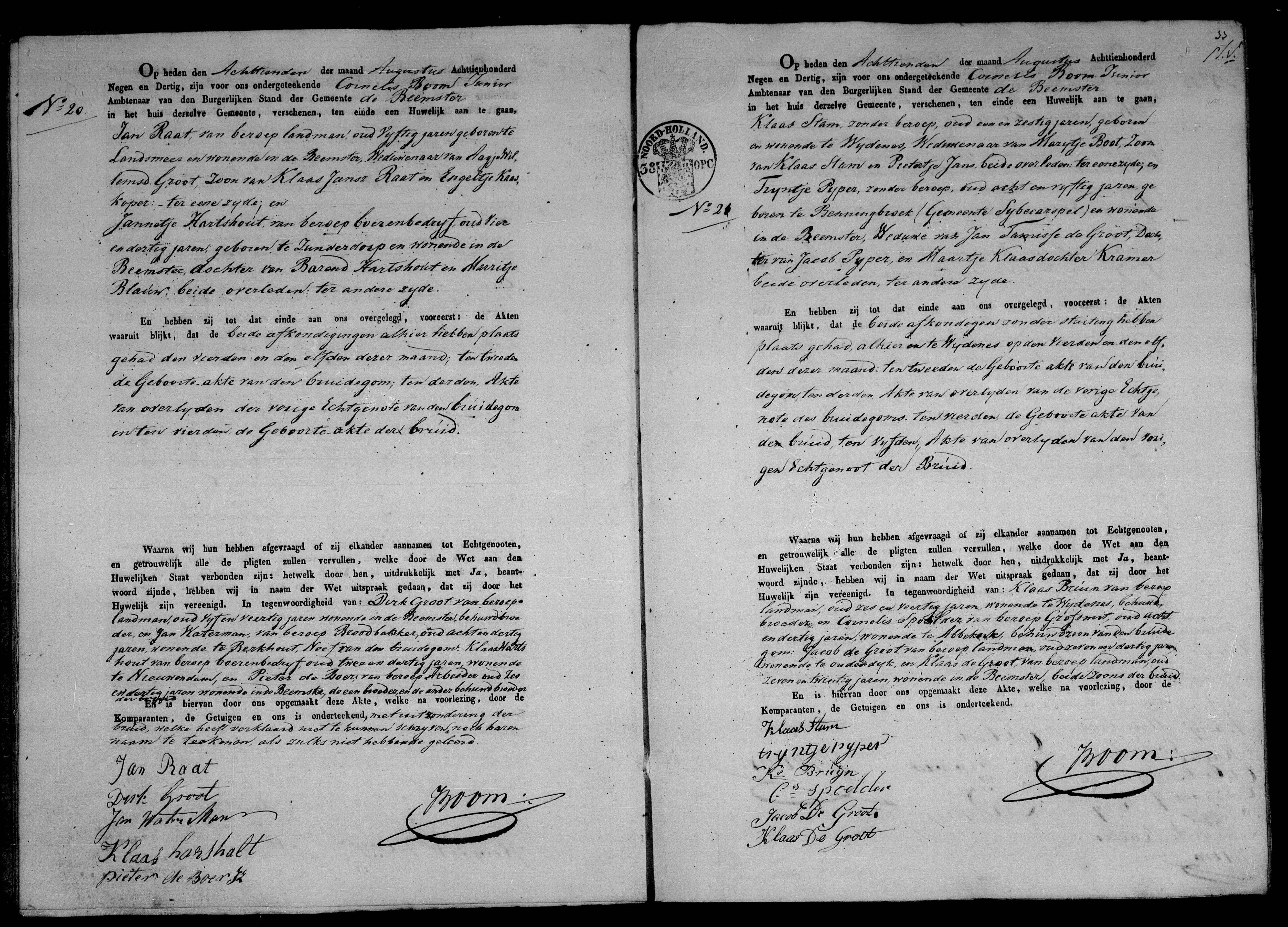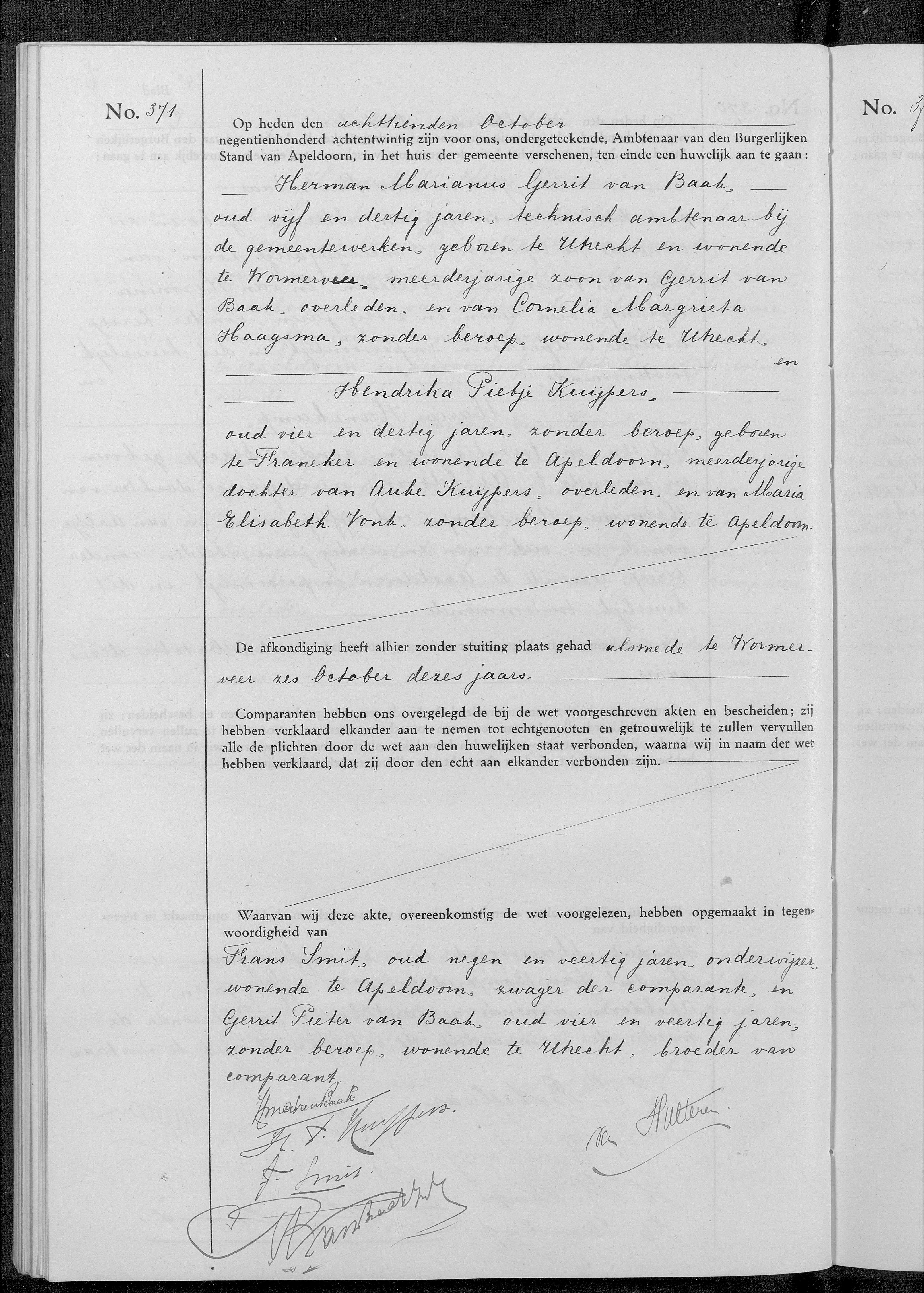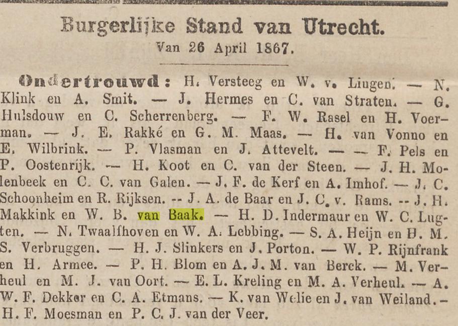 20. “uittreksel BS huwelijk van Baak-Langboom,” 3-5-1916, Lienden, 9096, 8, scan, Gelders Archief Arnhem.