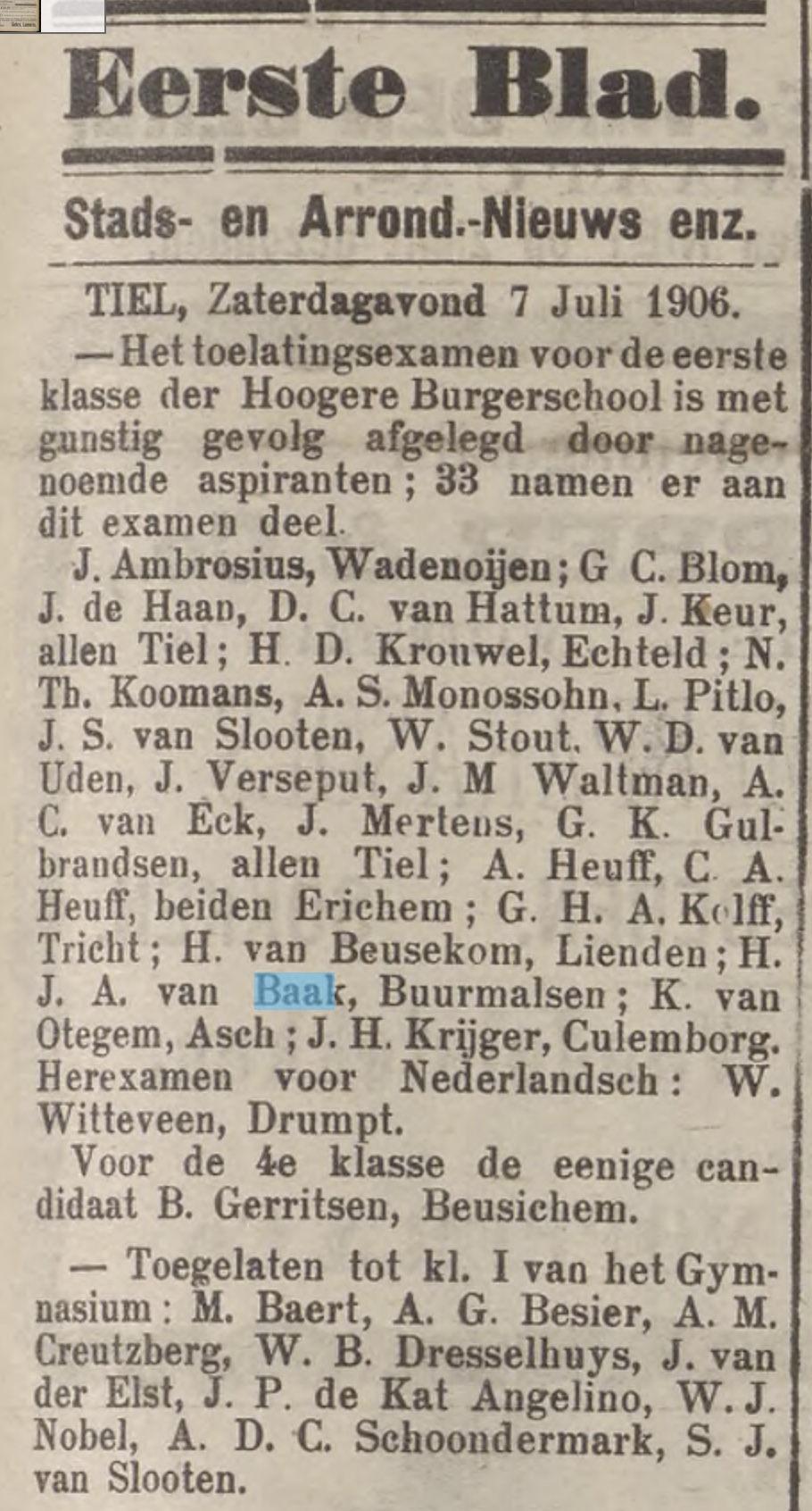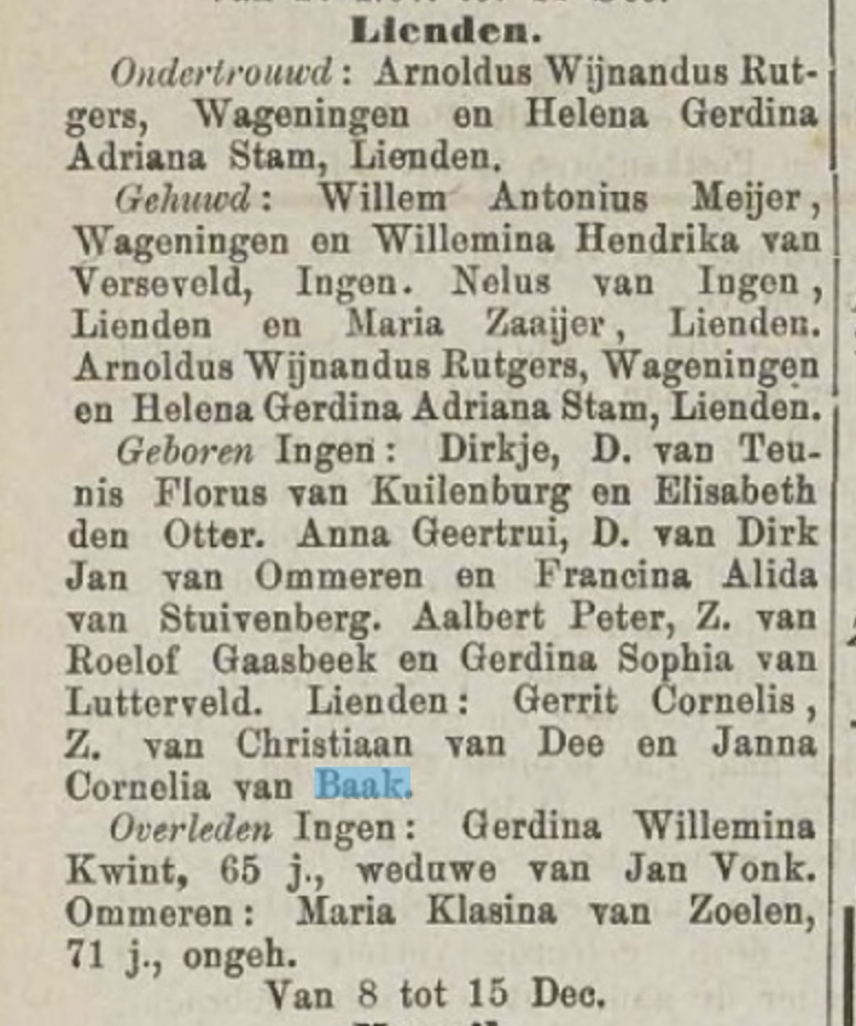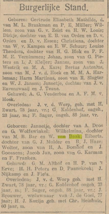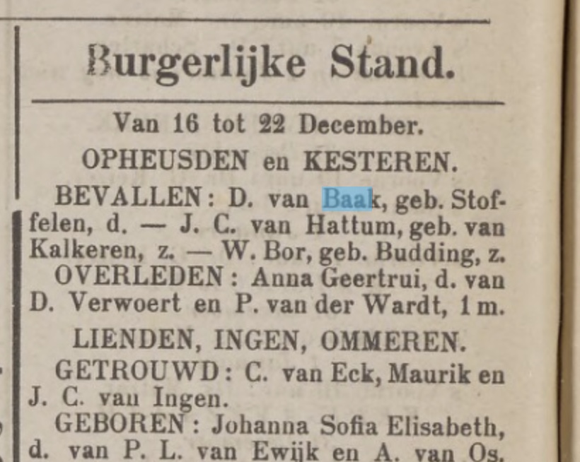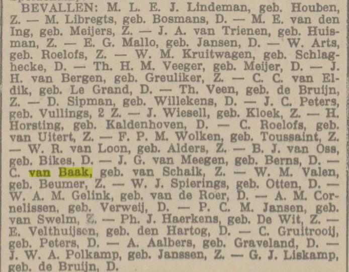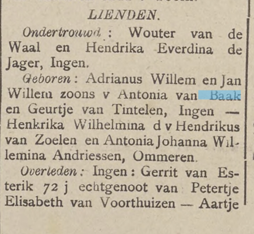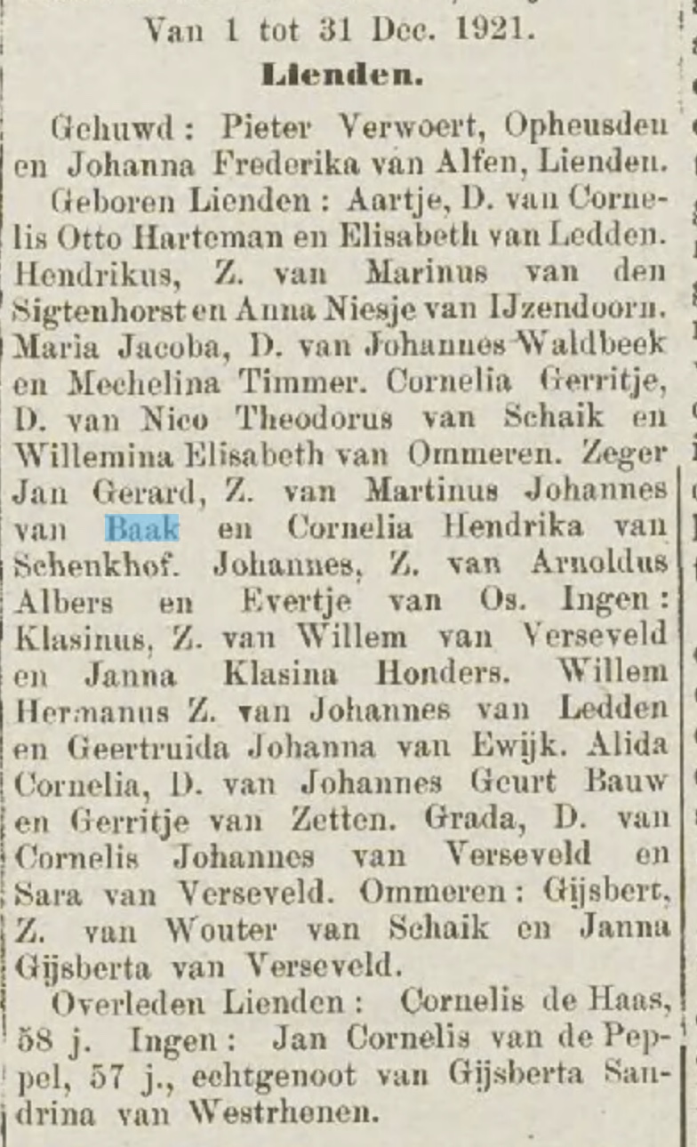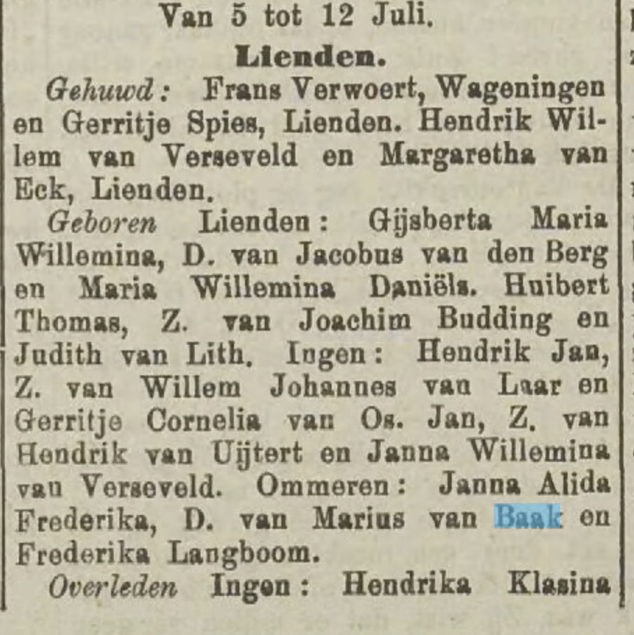 23. “geboorteberichten burgelijke stand Lienden - Janna Alida Frederika van Baak,” Nieuwe Tielsche Courant, 18-7-1917, 2, scan, Regionaal Archief Rivierenland.