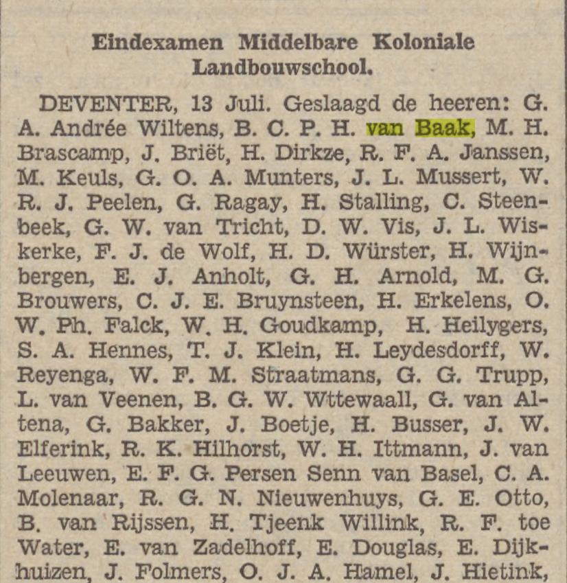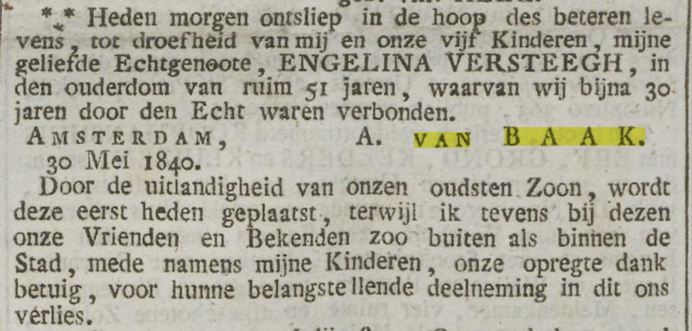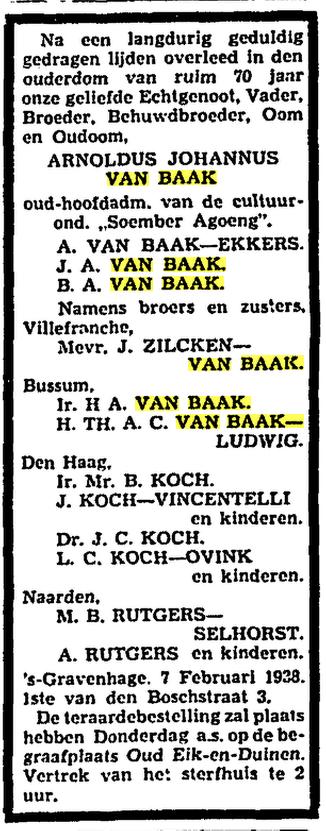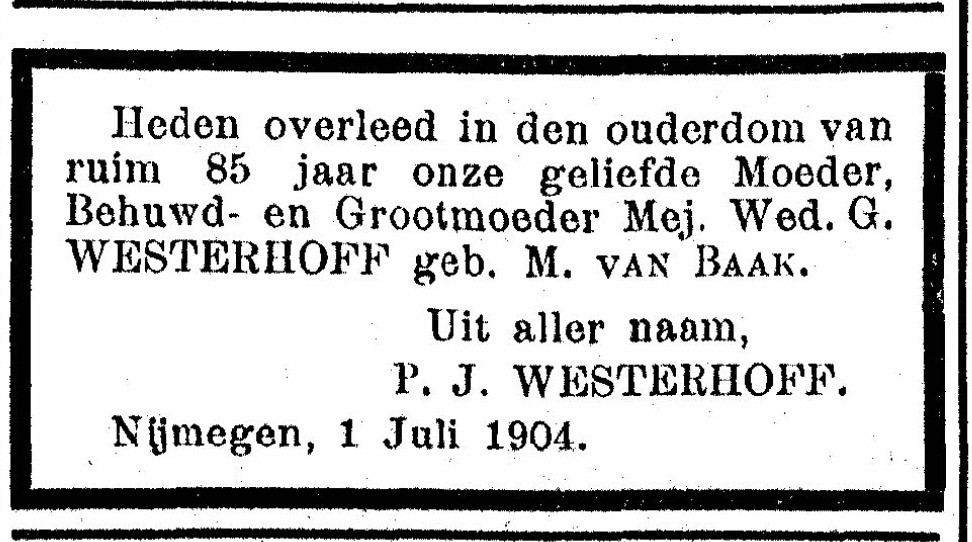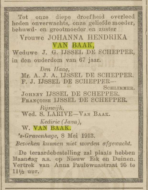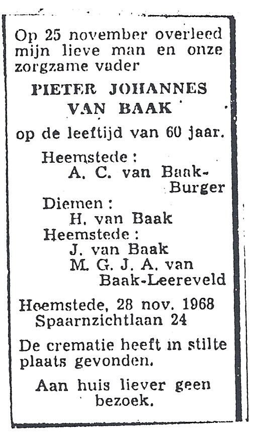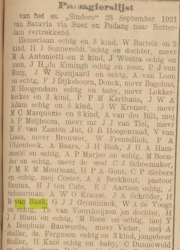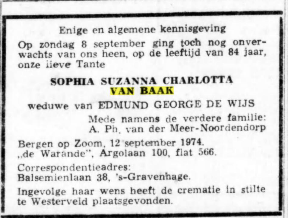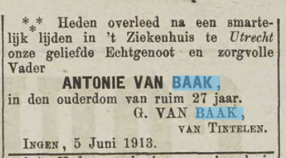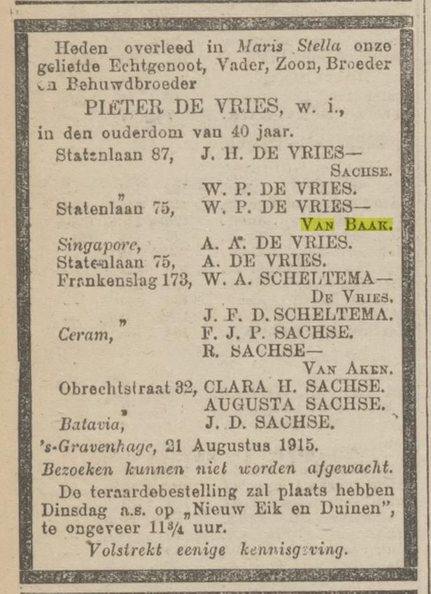 13. “overlijdensadvertentie Marius van Baak,” Haagsche Courant, ’s-Gravenhage, 17-9-1923, blad 3 pag 4, krant, familiearchief van Baak.